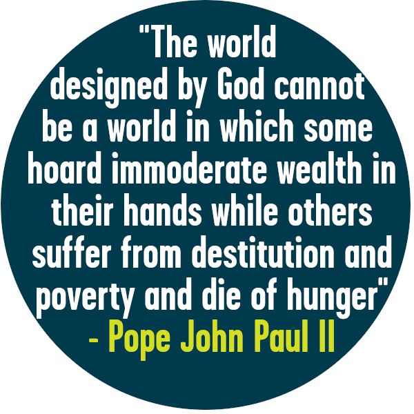 Today, the world’s richest 1% of people own 45% of the worlds wealth. Popularum Progressio, an encyclical or letter by Pope St Paul VI, highlights the need for change not just within countries, but on this global scale. Writing in 1967, Pope Paul says “unless the existing machinery is modified, the disparity between rich and poor nations will increase rather than diminish; the rich nations are progressing with rapid strides while the poor nations move forward at a slow pace.” This widening gap is something that we need to protect those in poverty against. It is our duty to share what we have with the poor, both locally and worldwide. St. Ambrose summarised this duty well when he said "You are not making a gift of what is yours to the poor man, but you are giving him back what is his. You have been appropriating things that are meant to be for the common use of everyone. The earth belongs to everyone, not to the rich." It is the duty of those who are able to fight for the rights of those who are poor, and ensure their voices are heard. Promoting the equality of everyone on earth, addressing their immediate needs, but also challenging the systems and people who are causing poverty.
